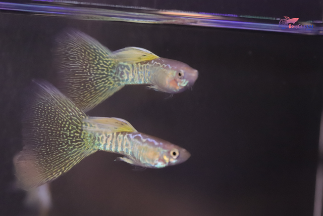 The Yellow King Cobra Guppy boasts a vivid yellow body adorned with intricate black cobra-like patterns